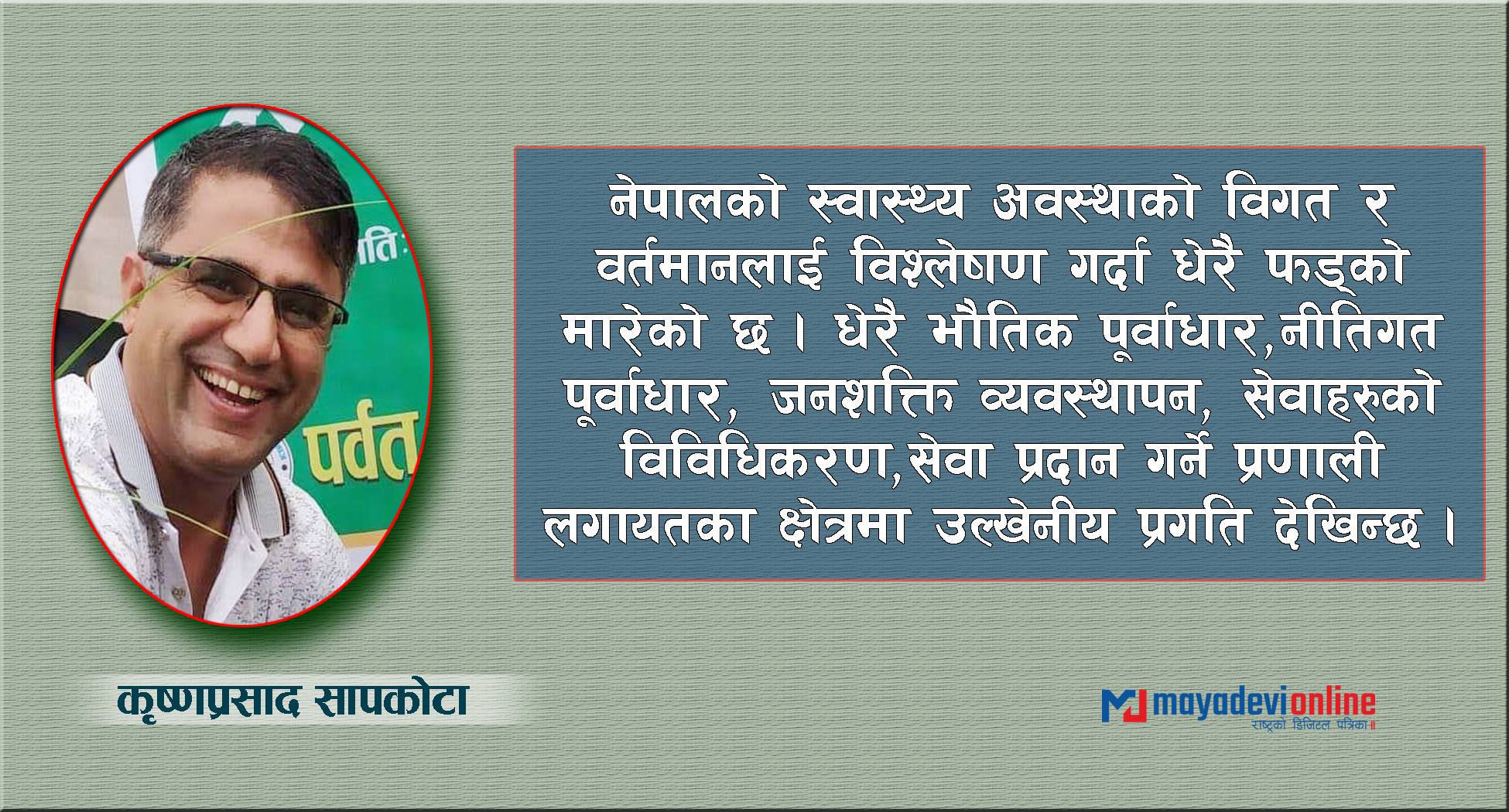 नेपालको स्वास्थ्य अवस्थाको विगत र वर्तमानलाई विश्लेषण गर्दा धेरै फडको मारेको छ । धेरै भौतिक पूर्वाधार, नीतिगत पूर्वाधार, जनशक्ति व्यवस्थापन, सेवाहरुको विविधिकरण, सेवा प्रदान गर्ने प्रणाली लगायतका क्षेत्रमा उल्खेनीय प्रगति देखिन्छ । स्वास्थ्य क्षेत्रका सामाजिक सूचकहरुलाई विश्लेषण गर्दा सानो स्केलबाट सुरु भएको स्वास्थ्य प्रणाली आज अन्तराष्ट्रिय तहको सेवा सुविधा पुर्याउन सफल भएको छ । यो सुखद पक्ष हो । प्रजातन्त्रको पुनस्थापना भएसँग सुरु भएको निजीकरण, उदारिकण विश्वव्यापीकरणसँगै नेपालको स्वास्थ्य क्षेत्रमा निजी क्षेत्रको प्रवेश भएको हुन्छ निजी क्षेत्रले स्वास्थ्य क्षेत्रमा राम्रो योगदान पुर्याएको छ भने संविधानले मौलिक हकको रुपमा स्वीकार गरेको गरी सोही अनुसार देशव्यापी स्वास्थ्य संचालन निर्माण भएका छन् । यो बीचमा हाम्रा नीतिले ७० प्रकार निशुल्क औषधी, १३ प्रकारका खोप, ४० प्रकारका स्वेदशी औषधी उत्पादन, आँखा, मुटु मिर्गौला, स्नायू हाडजोर्नी अंग प्रत्यारोपण, प्लाष्टिक सर्जरी क्यान्सर उपचार लगायतका विशिष्टिकृत सेवाहरु स्वेदेशमा हुनु, निजी क्षेत्रका लक्जरियस अस्पताल र नसिङ्ग होमको सेवा प्राप्त हुनु हामी सबैक गौरवको विषय हो ।