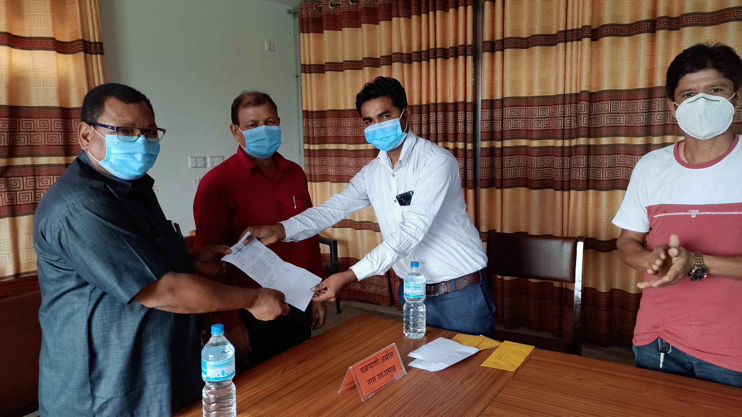 नगर अध्यक्ष राजु अधिकारीले मंगलबार दिउसो नगर प्रमुख मंगलप्रसाद थारु, उप-प्रमुख चक्रपाणी अर्याल, शिक्षा, युवा तथा खेलकुद शाखाका प्रमुख बाबुराम भट्टराईलाई ज्ञापन पत्र बुझाउनु भएको थियो ।