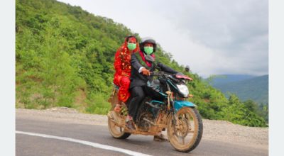 संखुवासभा । सङ्खुवासभाको खाँदबारी नगरपालिका –८ का सन्तोष श्रेष्ठले निषेधाज्ञाका बीच बेहुलीलाई आफैले मोटरसाइकलमा चढाएर