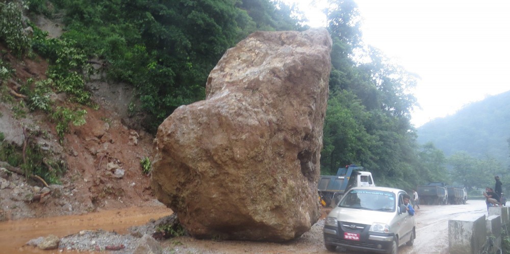 नारायणगढ–मुग्लिन सडकको १४ किलोमा बिहीबार साँझ पहिरोसँगै ठूलो ढुंगा खस्दा सडक आधा ढाकेको छ । आडैको डाँडाबाट साँझ सात बजेतिर लेदोसहित ढुंगा खसेको थियो ।