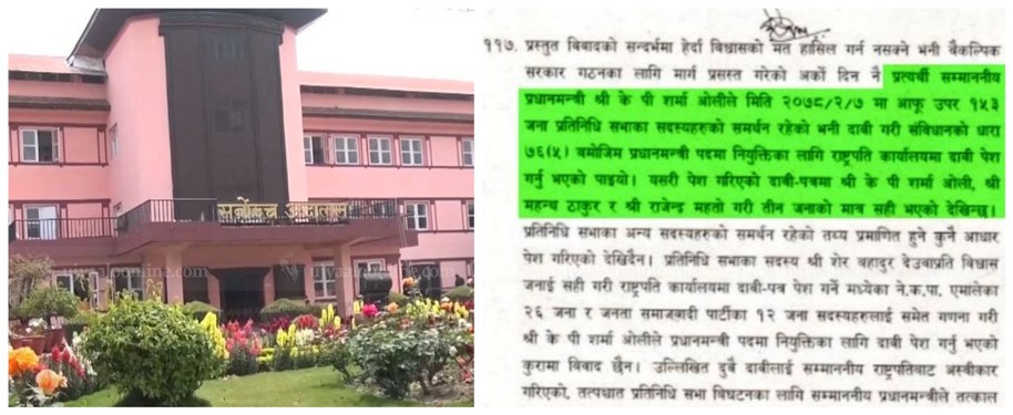 आफूलाई प्रधानमन्त्रीमा नियुक्त गर्न भन्दै राष्ट्रपति समक्ष दाबी पेस गर्ने क्रममा प्रधानमन्त्री केपी शर्मा ओलीले जम्मा तीन जना सांसदको हस्ताक्षर मात्रै बुझाएको पाइएको छ । गएको जेठ ७ गते मध्यरातमा प्रतिनिधि सभाको विघटन हुनुअघि प्रधानमन्त्रीमा दाबी पेस गर्दा केपी शर्मा ओलीले आफ्नो पक्षमा बहुमत छ भने पनि तीन जनाले मात्रै ओलीको पक्षमा हस्ताक्षर गरेको भेटिएको अदालतले जनाएको छ । प्रधानमन्त्रीमा दाबी गर्दा केपी शर्मा ओलीका तर्फबाट स्वयम् केपी शर्मा ओली, राजेन्द्र महतो र महन्थ ठाकुरको मात्रै हस्ताक्षर राष्ट्रपति कार्यालयमा बुझाइएको फैसलामा उल्लेख छ ।