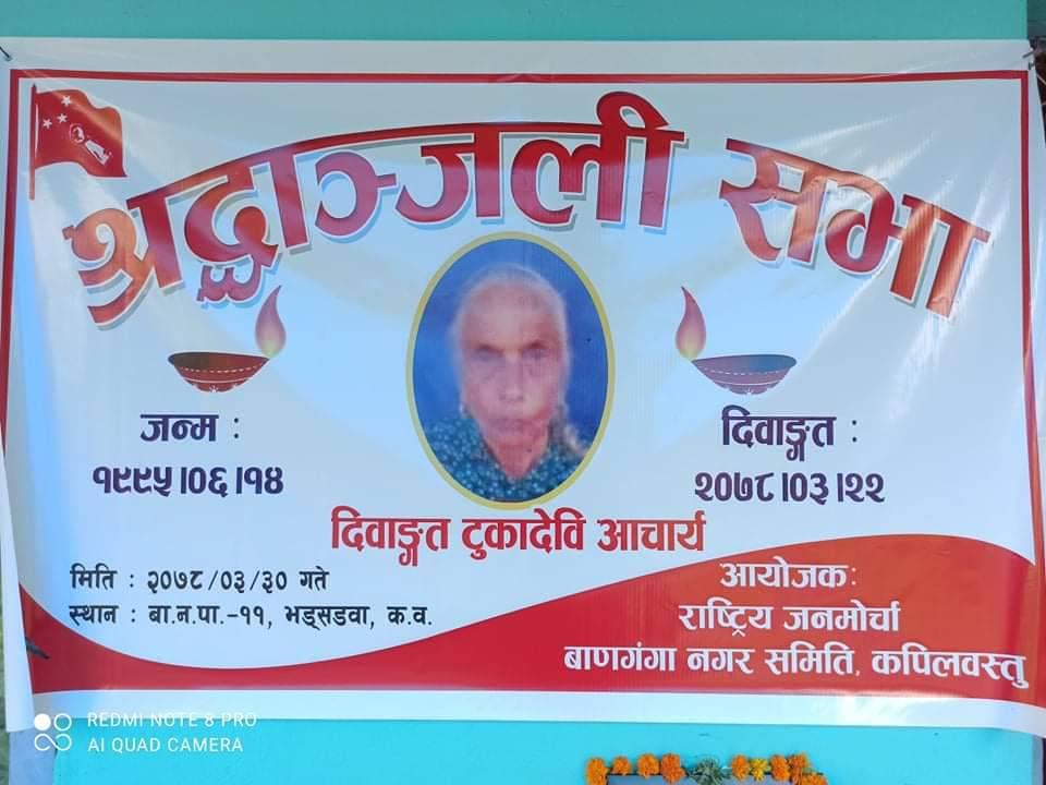 राष्ट्रिय जनमोर्चा बाण्गंगा नगर कमिटीको अयोजनामा बाणगंगा ११ भड्सरहवामा शोक सभा सम्पन्न भएको छ । राष्ट्रिय जनमोर्चाका क्रियाशिल सदस्य चिरञ्जीवी आाचार्य कि ममतामयी आमा टुकादेवी आचार्यको निधन प्रती उहाँकै निवासमा नवौं दिनको दिनमा शोकसभा सम्पन्न भएको हो । उहाँको ८३ वर्षको उमेरमा निधन भएको थियो ।