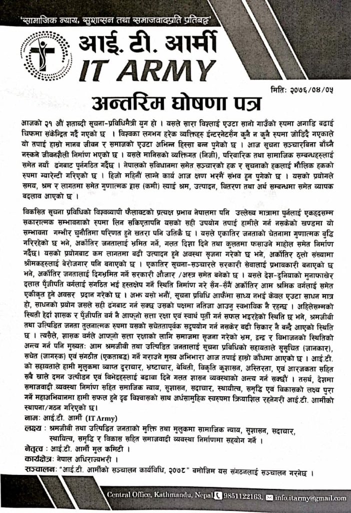 आइटीको सहायताले हामी मुलुकमा ब्याप्त दुराचार, बेथिथि, विकृति, कुशासन, अराजकतासहित सबैखाले दमन उत्पीडन एवं विभेदलाई बढवा दिने गलत शासन व्यवस्थाको अन्त्य गर्न सक्छौ,’ अन्तरिम घोषणापत्रमा भनिएको छ, ‘तसर्थ देशमा समाजवादी व्यवस्था निर्माण सहित सामाजिक न्याय, सुशासन, सदाचार, स्थायीत्व, समृद्धि एवम् विकासको लक्ष्य पुरा गर्ने महाअभियनामा हामी सफल हुने दृढ विश्वासको साथ अर्ध सामुहिक स्वरुपमा क्रियाशील रहनेगरी आईटी आर्मीको स्थापना गरिएको छ। आईटी आर्मीको केन्द्रीय कमिटी १ सय ५१ सदस्यीय हुनेछ।आइटी आर्मीका प्रदेश कमिटीहरू १०१ सदस्यीय प्रस्ताव गरिएको छ। यस्तै जिल्ला कमिटी ५१ सदस्यीय तथा पालिका कमिटी ३३ सदस्यीय प्रस्ताव छ।