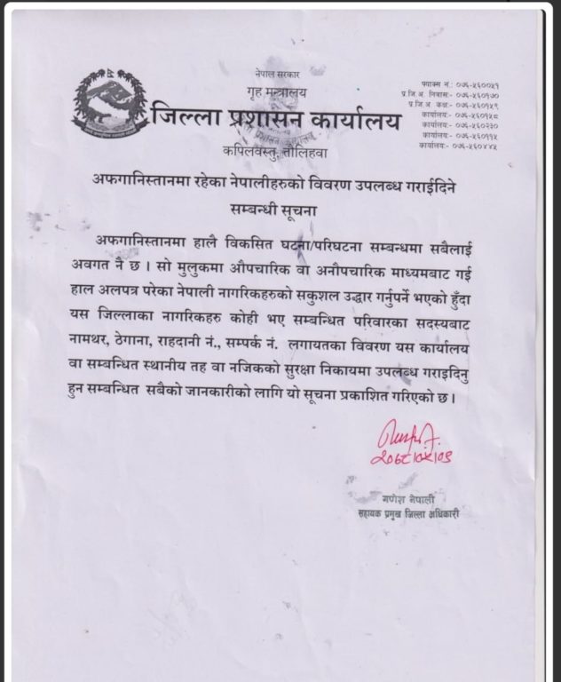 प्रमुख जिल्ला अधिकारी चक्रपाणी पाण्डेद्धारा हस्ताक्षरित सूचनामा भनिएको छ ‘अफगानिस्तानमा हालै विकसित घटना परिघटना सम्बन्धमा सबैलई अवगत नै छ । सो मुलकुमा औपचारिक या अनौपचारिक माध्यमबाट गई हाल अलपत्र परेका नेपाली नागरिकको तत्काल सकुशल उद्धार गर्नु पर्ने भएको हुँदा यस जिल्लाका नागरिक कोही भए सम्बन्धित परिवारका सदस्यबाट नाम थर, ठेगाना, राहदानी नम्बर, सम्पर्क नम्बर लगायतका विवरण यस कार्यालय या सम्बन्धित स्थानयि तह या नजिकको सुरक्षा निकायमा उपलब्ध गराइदिनु हुन सबैको जानकारीको लागि यो सूचना प्रकाशित गरिएको छ ।’प्रजिअ पाण्डेले तथ्यांक पाउनासाथ उद्धारको लागि पहल गर्ने मायादेवी अनलाइनसंग बताउनु भयो ।