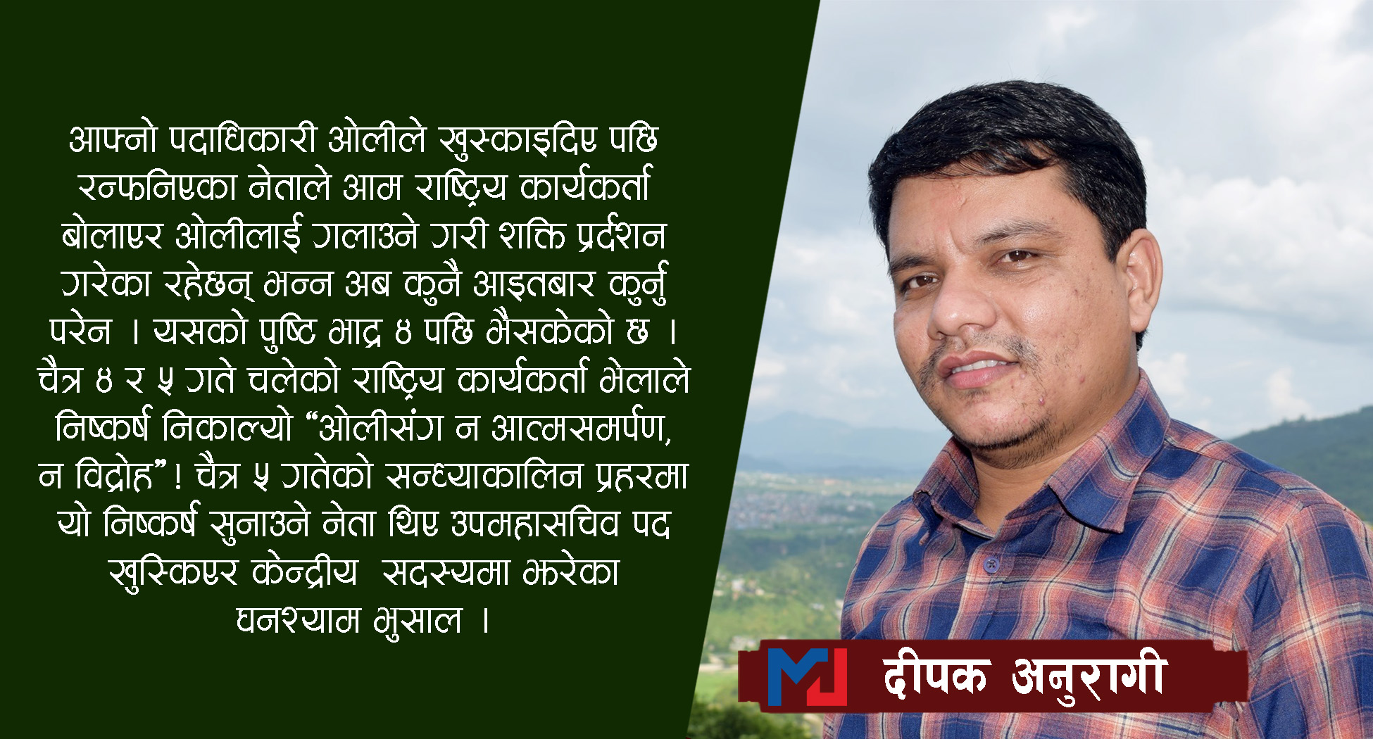 पार्टी अध्यक्ष ओलीको दम्भ र अहंकारका बीच आयोजित राष्ट्रिय कार्यकर्ता भेलाले पार्टी फुटकै दिशा तय गर्ने त होइन् भन्ने आमचासो थियो । यद्यपि राष्ट्रिय कार्यकर्ता भेला नेताहरुको स्वार्थमा आयोजित भएको कारण आमचासो जस्तो नहुनु स्वभाविक थियो । आफ्नो पदाधिकारी ओलीले खुस्काइदिए पछि रन्फनिएका नेताले आम राष्ट्रिय कार्यकर्ता बोलाएर ओलीलाई गलाउने गरी शक्ति प्रर्दशन गरेका रहेछन् भन्न अब कुनै आइतबार कुर्नु परेन । यसको पुष्टि भैसकेको छ । दुई दिन चलेको राष्ट्रिय कार्यकर्ता भेलाले निष्कर्ष निकाल्यो ‘ओलीसंग न आत्मसमर्पण, न विद्रोह’ ! चैत्र ५ गतेको सन्ध्याकालिन प्रहरमा यो निष्कर्ष सुनाउने नेता थिए उपमहासचिव पद खुस्किएर केन्द्रीय सदस्यमा झरेका घनश्याम भूसाल ।