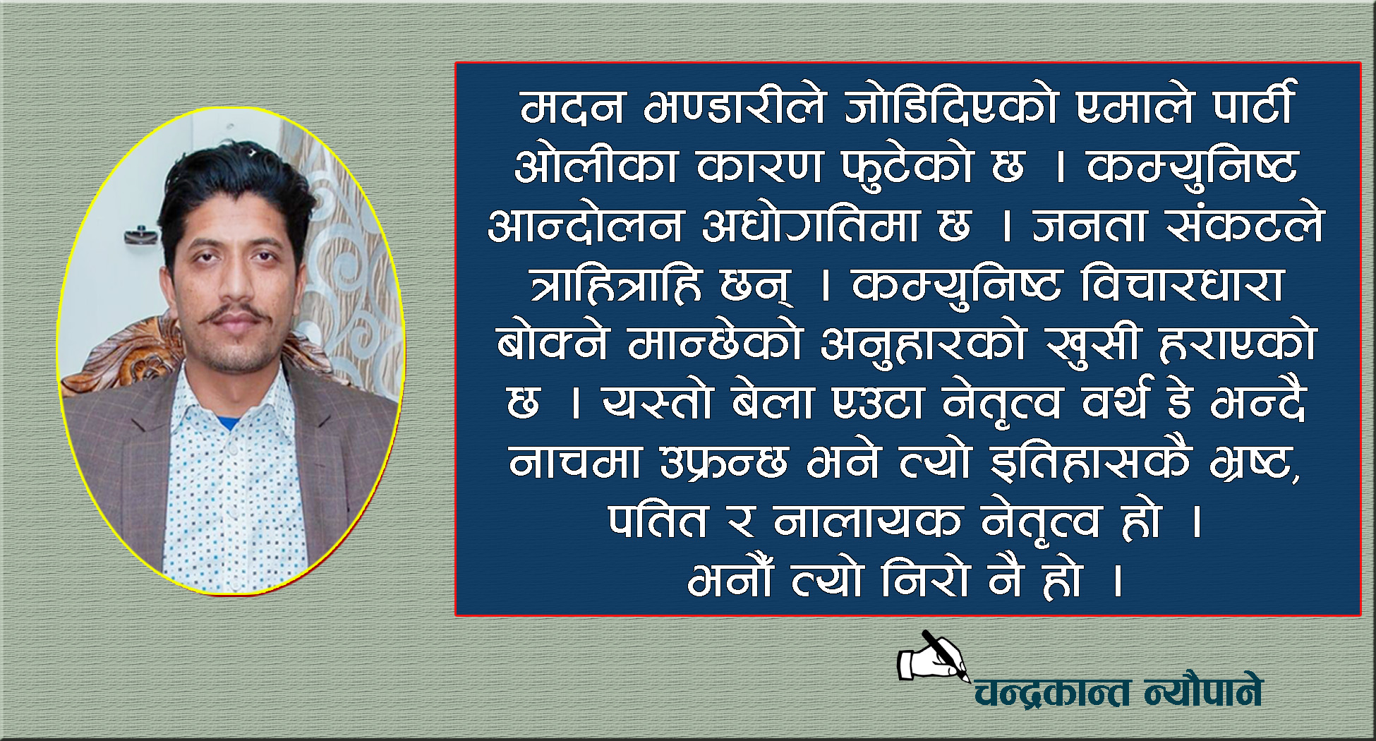 मदन भण्डारीले जोडिदिएको एमाले पार्टी ओलीका कारण फुटेको छ । कम्युनिष्ट आन्दोलन अधोगतिमा छ । जनता संकटले ‘त्राहित्राहि’ छन् । कम्युनिष्ट विचारधारा बोक्ने मान्छेको अनुहारको खुसी हराएको छ । यस्तो बेला एउटा नेतृत्व वर्थ डे भन्दै नाचमा उफ्रन्छ भने त्यो इतिहासकै भ्रष्ट, पतित र नालायक नेतृत्व हो । भनौँ त्यो निरो नै हो ।
