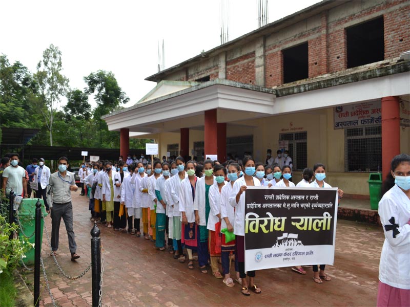 स्वास्थ्यकर्मी माथि हुने दुर्व्यवहार बन्द गर, सुरक्षाको प्रत्याभूति गर, सुरक्षाको ग्यारेन्टी गर, स्वास्थ्य संस्थामा काम गर्ने वातावरण सिर्जना गरलगायतका नारा लगाउँदै उनीहरुले तुलसीपुर बजार परिक्रमा गरेका थिए ।