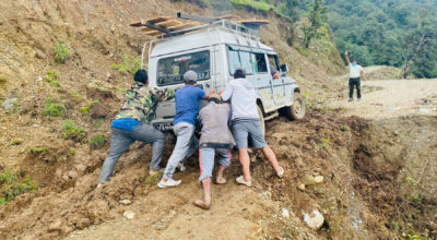 बागलुङमा कच्ची बाटोमा रोकिएको जिप धकेल्दै । तस्बिरः रासस।