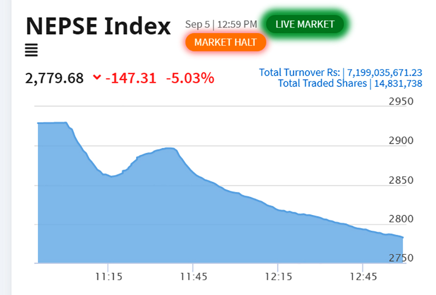 पाँच प्रतिशतले घटेपछि शेयर बजारको कारोबार बन्द भएको छ । बजार खुलेको २ घण्टामै नेप्से एक सय ४७ अङ्क अर्थात पाँच प्रतिशतले घटेपछि नकारात्मक सर्किट लागेर बजार बन्द भएको नेपाल स्टक एक्सचेञ्जले जनाएको छ ।