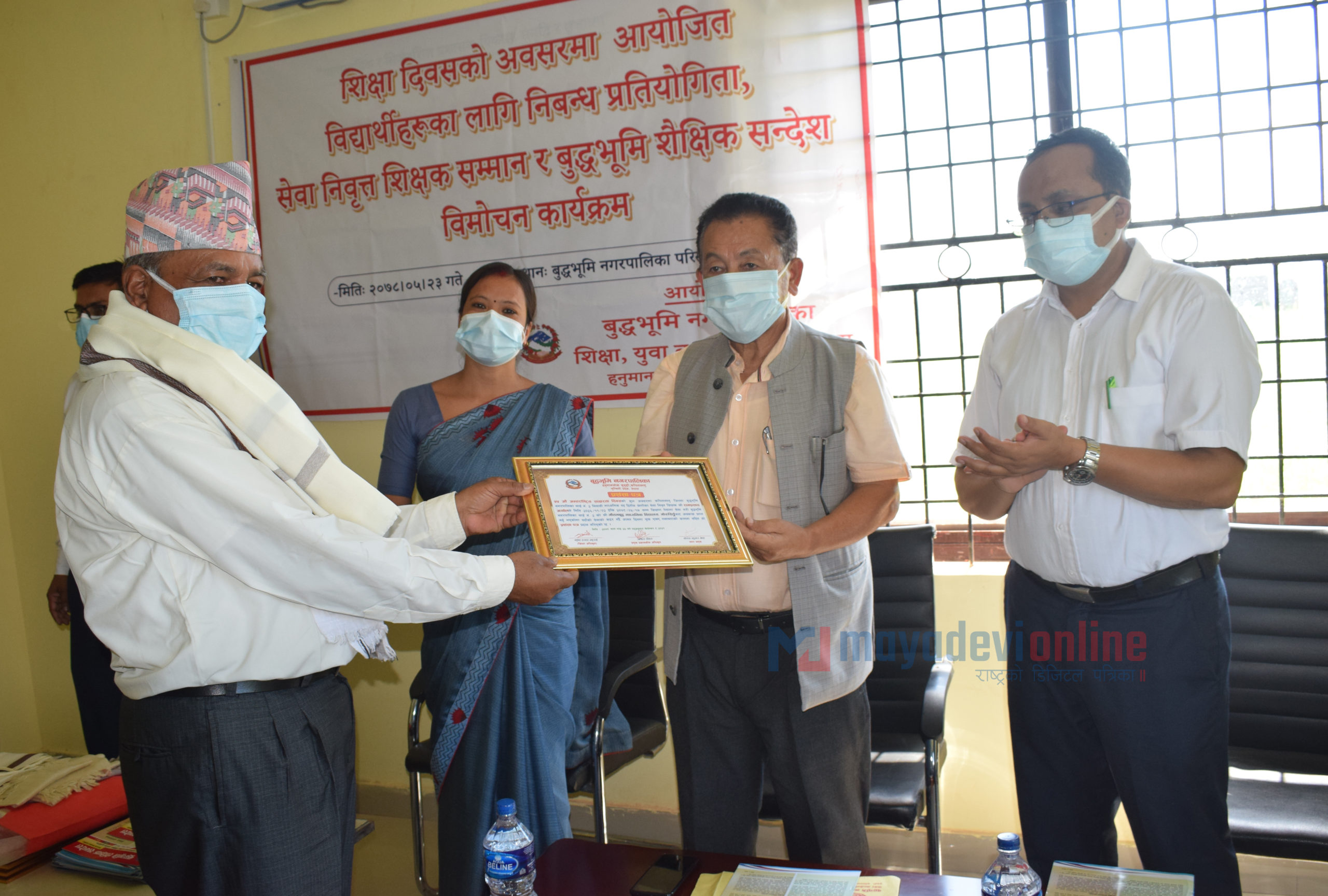 सेवा निवृत्त शिक्षकलाई सम्मान गर्दै नगर प्रमुख केशव कुमार श्रेष्ठले आधा जीवन शिक्षक पेशामा समर्पित भई सामाज रुपान्तरणमा महत्वपूर्ण योगदान गरेका शिक्षकलाई हैसला प्रदानका लागि यस्तो कार्यक्रम राखिएको बताउनुभयो । शिक्षक पेशाबाट सेवा निवृत्त भएपनि समाज रुपान्तरणमा अनुभव, ज्ञानको आवश्यकता रहेको भन्दै बुद्धभूमिको विकासमा आ–आफ्नो क्षेत्रबाट योगदान गर्न आग्रह गर्नुभयो । शिक्षा क्षेत्रको विकास विना अरु क्षेत्रको विकास सोचेजस्तो नहुने भन्दै अब गुणस्तरीय शिक्षामा सबैले जोड दिनुपर्ने बताउनुभयो । नगरपालिकाको ध्यान शिक्षाको सुधार तर्फ रहेको भन्दै विद्यालयस्तरमा हुने अभावलाई विस्तारै हल गर्दै जाने बताउनुभयो ।