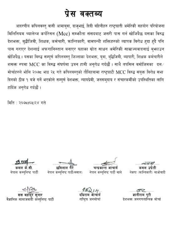 विहीबार संयुक्त विज्ञप्ति जारी गर्दै नेपाल कम्युनिष्ट पार्टी, नेपाल कम्युनिष्ट पार्टी (मसाल), नेपाल कम्युनिष्ट पार्टी (माले), नेकपा (क्रान्तिकारी माओवादी), बैज्ञानिक समाजवादी कम्युनिष्ट पार्टी, राष्ट्रिय जनमोर्चा र देशभक्त जनगणतान्त्रिक मोर्चाले विरोध सभामा उपस्थित हुनका लागि जिल्लाका युवा, बुद्धिजिवी, व्यापारी, देशभक्त, क्रान्तिकारी र बामपन्थी नागरिकलाई आग्रह गरेका छन् ।