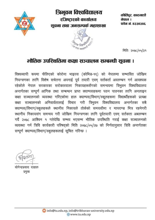 त्रिवि कार्यकारी परिषद्को भदौ २७ गते बसेको बैठकले स्थानीय तहसँग समन्वय गरी जोखिम नियन्त्रणका लागि पूर्वतयारी एवं सर्तकता अवलम्बन गर्दै शुक्रबारबाट सम्भव भएसम्म भौतिक उपस्थिति गराई कक्षा सञ्चालनको व्यवस्था गर्न निर्देशन दिएको सूचना तथा जनसम्पर्क महाशाखाका प्रमुख योगेन्द्रप्रसाद दाहाल बताए ।