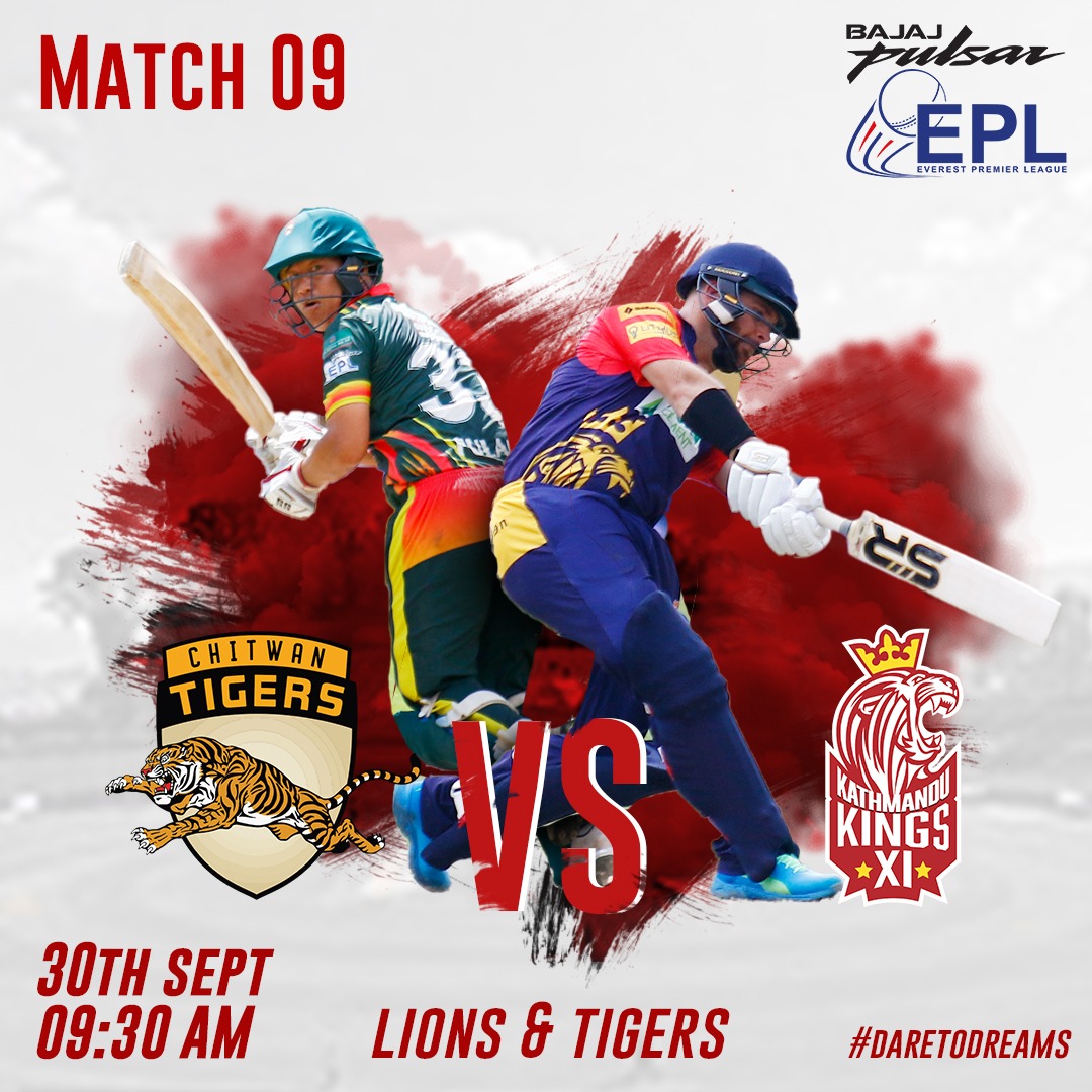 एभरेस्ट प्रिमियर लिग ईपीएल टी–२० क्रिकेटमा चितवन टाइगर्सले काठमाण्डौ किङ्ग्स इलाभेनलाई तीन विकेटले हराएको छ । त्रिवि क्रिकेट मैदानमा काठमाण्डौले दिएको एक सय ४२ रनको लक्ष्य चितवनले आठ विकेट गुमाएर आठ बल बाँकी छँदै भेटायो । चितवनका लागि राजेश पुलामीले सर्वाधिक २६ र दिलिपनाथ र कमलसिंह ऐरीले समान २३र२३ रन बनाए । काठमाण्डौका जितेन्द्र मुखिया र रायन बर्लले दुईरदुई विकेट लिए ।