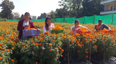 दाङको घोराही–१५, भरतपुरमा तिहारका लागि सयपत्री फूल टिप्दै महिला । एउटा मालाको ८० देखि सय