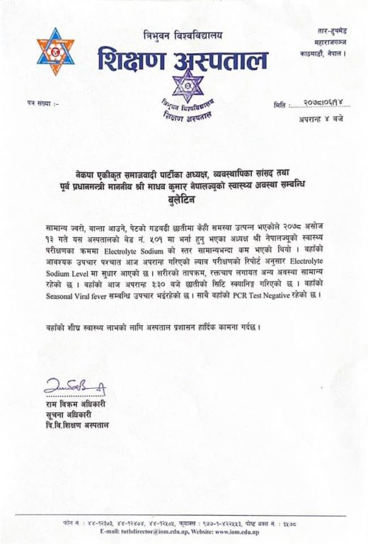 नेकपा (एकीकृत समाजवादी)का अध्यक्ष तथा पूर्व प्रधानमन्त्री माधवकुमार नेपालको स्वास्थ्य अवस्थाबारे उनी उपचाररत त्रिवि शिक्षण अस्पतालले जानकारी सार्वजनिक गरेको छ ।