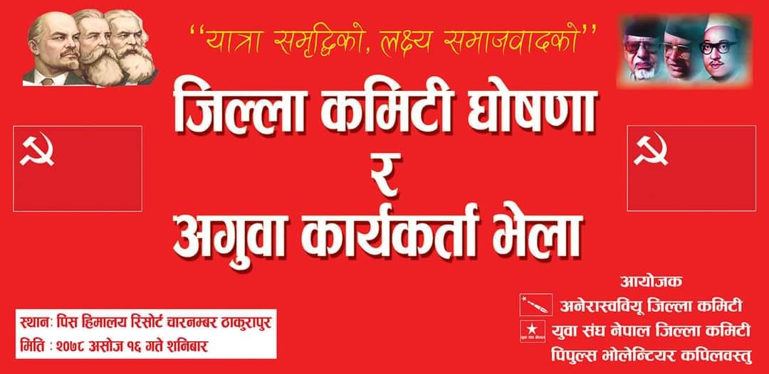नेकपा (एस) निकट युवा संघ नेपाल, अनेरास्ववियू र पिपुल भोलेन्टियर्स कपिलवस्तुले आज संयुक्त कार्यक्रम गर्न लागेका छन् । जिल्लाको वाणगंगा नगरपालिका चारनम्बर ठाकुरपुरमा रहेको पिस हिमालय रिसोटमा यी तीन संगठनले जिल्ला कमिटी घोषणा कार्यक्रम गर्न लागेका हुन् ।