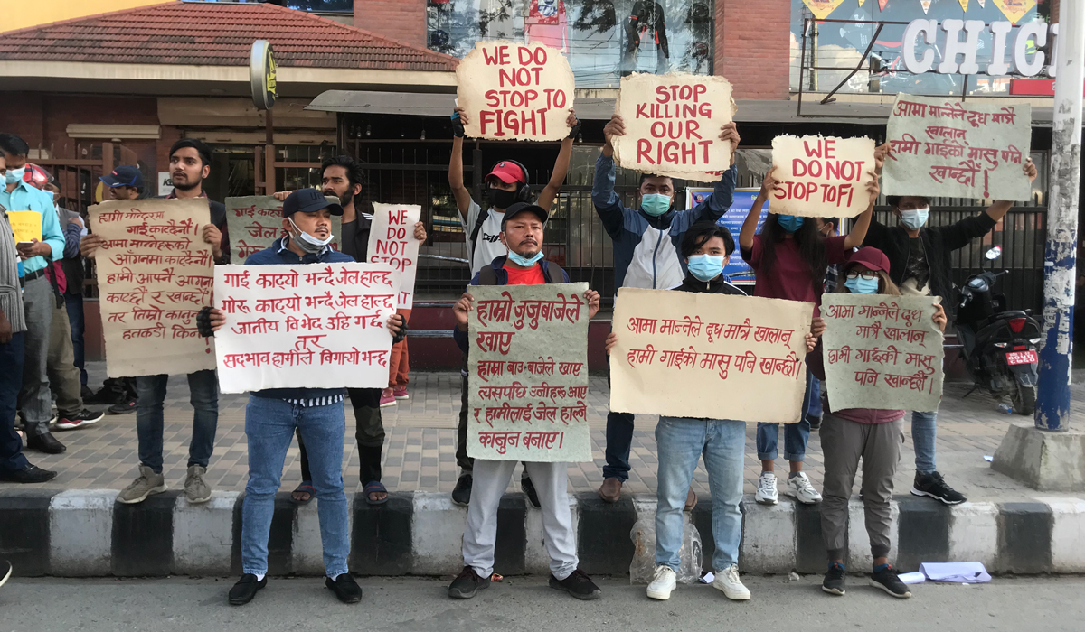गाईगोरुको मासु खाएको आरोपमा देशका विभिन्न स्थानबाट नागरिक पक्राउ गर्ने र जेल हल्ने जस्ता घटनाहरु बढेको भन्दै समितिले प्रदर्शन गरेको हो ।