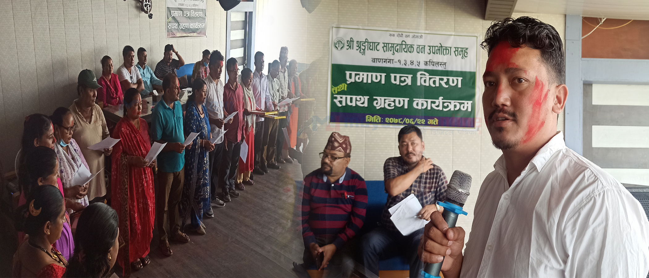 कपिलवस्तुको बाणगंगास्थित श्रृङ्गीघाट सामुदायिक बन उपभोक्ता समितिका नवनिर्वाचित पदाधिकारीले पद तथा गोपनीयताको सपथ लिएका छन् । निर्वाचन मण्डलले शुक्रबार विहान श्रीपेच होटलमा गरेको कार्यक्रममा अध्यक्ष गणेश बहादुर शाही (सुशील), उपाध्यक्ष बुद्ध बहादुर शाही, सचिव शुष्मा खाँण, कोषाध्यक्ष हरि प्रसाद पौडेल, सह-सचिव तिल कुमारी हमाल, अन्य सदस्य, लेखा समिति सदस्यलाई निर्वाचन मण्डल संयोजक कमल आचार्यले पद तथा गोपनीयताको सपथ ग्रहण गराउनु भएको थियो । यस्तै कार्यक्रममा निर्वाचित पदाधिकारीलाई प्रमाण पत्र पनि हस्तान्तरण गरिएको छ ।