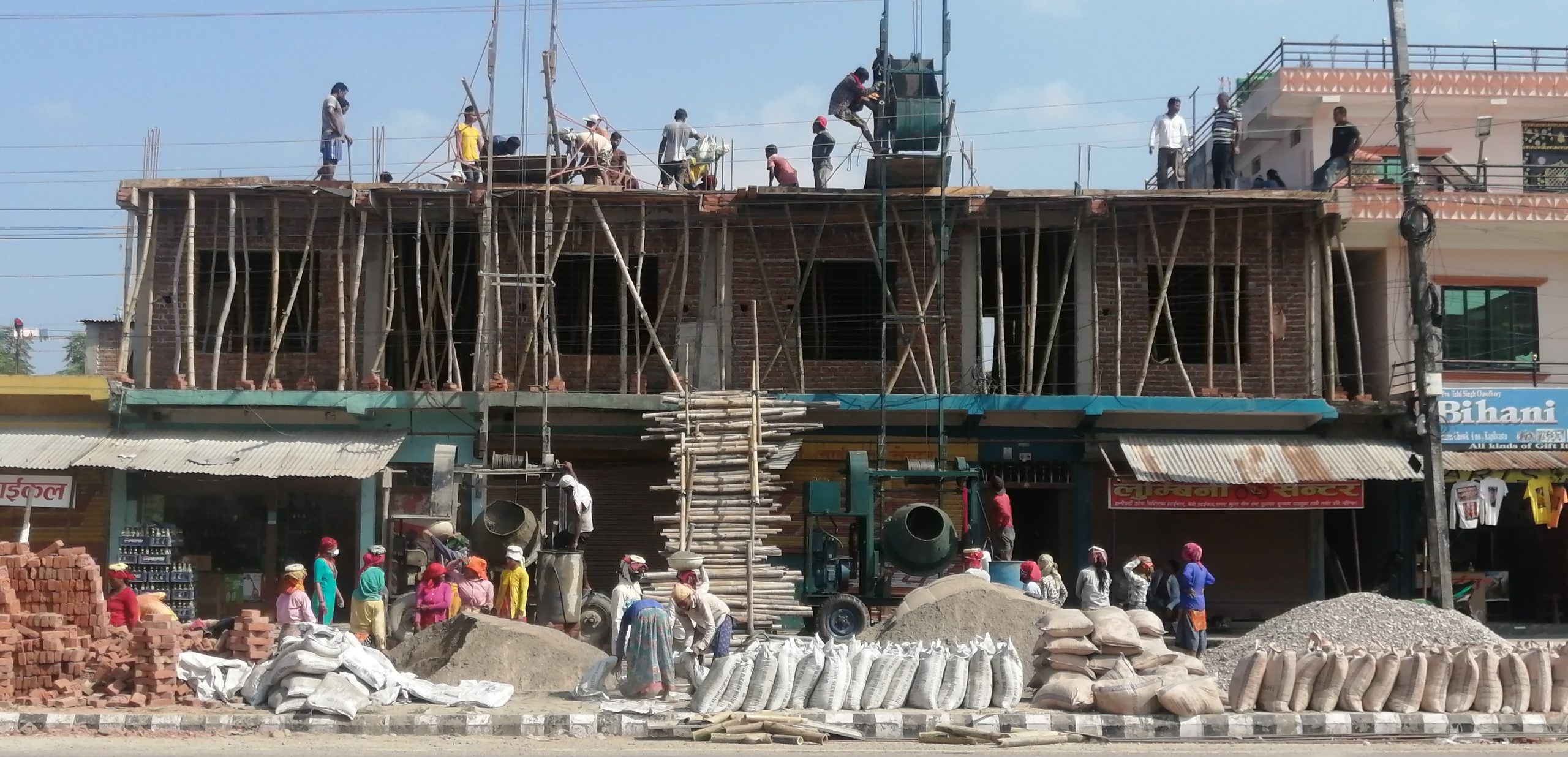 कपिलवस्तुको वाणगंगा नगरपालिकाको एक घर बनाउँदै मजदुर । अधिकांशले महाअष्टमी पर्व मनाईरहदा बुधबार यी मजदुर घर बनाउन व्यक्त देखिन्थे । तस्बीरः मायादेवी अनलाइन