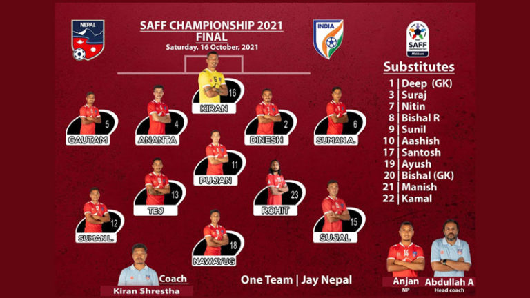 भारतविरुद्ध फाइनल खेल्न नेपाली टोलीको नाम सार्वजनिक गरिएको छ। सुरुआती टिममा कप्तान तथा गोलरक्षक किरण लिम्बूसहित अनन्त तामाङ, दिनेश राजवंशी, गौतम श्रेष्ठ, पुजन उपरकोटी, सुमन अर्याल, सुमन लामा, तेज तामाङ, सुजल श्रेष्ठ, नवयुग श्रेष्ठ र रोहित चन्द रहेका छन्।
