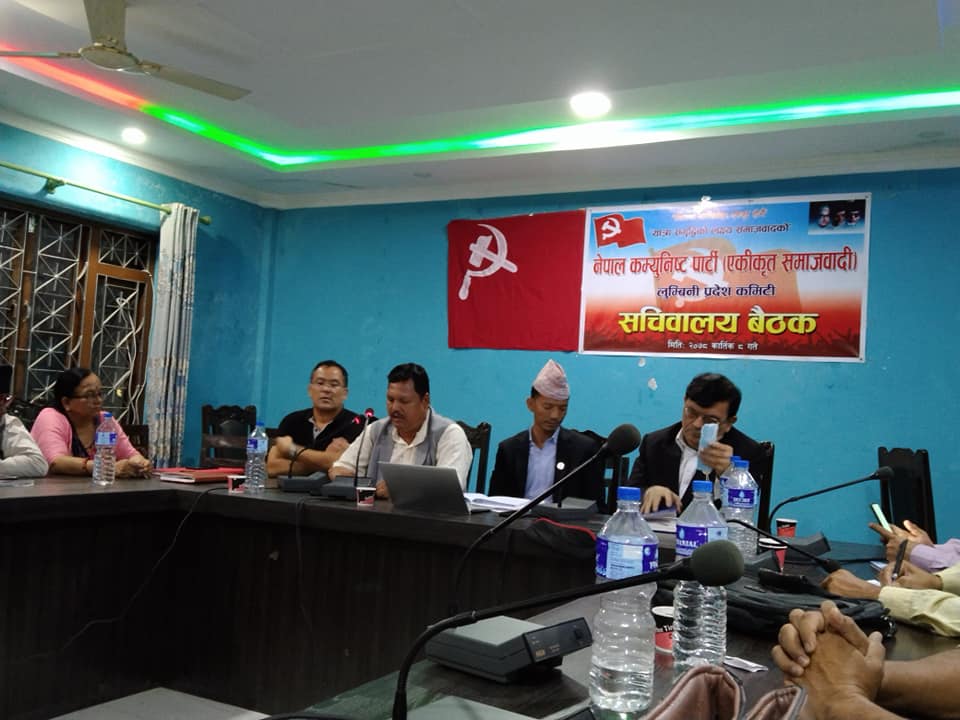 नेकपा (एकीकृत समाजवादी) लुम्बिनी प्रदेश कमिटी सचिवालय बैठकले महत्वपूर्ण निर्णय गरेको छ । सोमबार बुटवलमा बसेको प्रदेश कमिटी सचिवलाय बैठकले प्रदेश कमिटीलाई पूर्णता दिदैं जिम्मेवारी समेत बाँडफाँड गरेको छ ।