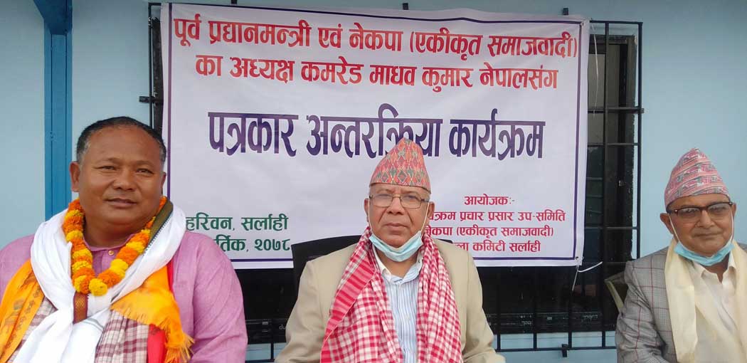 दुई तिहाई बहुमत भएको पार्टीलाई केपी ओलीले विभाजनको दिशामा लगेको नेपालले आरोप लगाए। ‘पहिले माओवादी पार्टीलाई अलग पारेर पछि हामीलाई पनि घोक्र्याएर पार्टीबाट निकाल्नुभयो। आत्मसमपर्ण गरौंला, टाँगमुनि छिरौंला भन्ने उहाँले सोच्नु भएको थियो’, उनले भने, ‘हामी सम्माजनक एकताको पक्षमा थियौं। तर, केपी ओलीको रबैयामा कुनै सुधार भएन्। उहाँले नीतिभन्दा नेता ठूलो भन्ने मान्यता बोक्नु भयो।’
