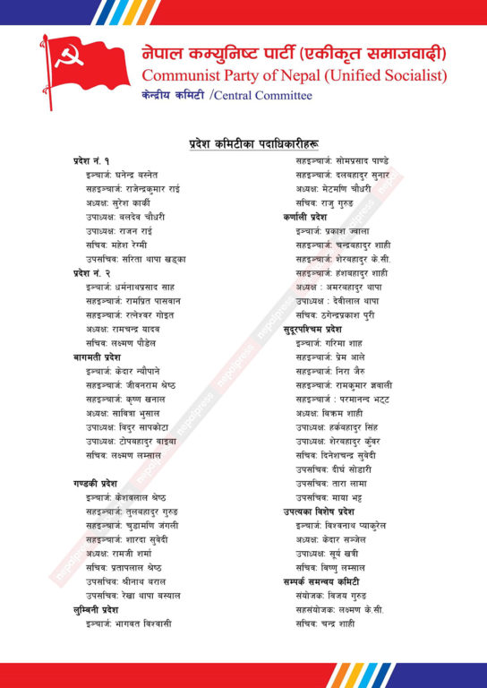 नेकपा (एकीकृत समाजवादी) ले सातै प्रदेश सातै प्रदेश कमिटी गठन गरेको छ । प्रदेश कमिटीमा सो पार्टीले इन्चार्ज, सहइन्चार्ज, अध्यक्ष, उपाध्यक्ष २, सचिव र उपसचिव मनोनयन गरेको छ ।