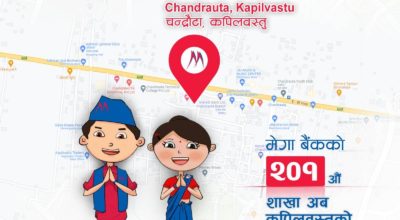 काठमाडौं । मेगा बैंक नेपाल लिमिटेडले कपिलवस्तु जिल्लाको चन्दौटामा नयाँ शाखा विस्तार गरेको छ ।