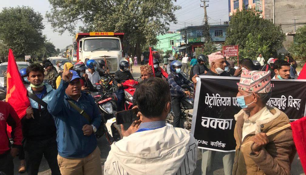 पेट्रोलियम पदार्थका भएको मूल्य बृद्धिको विरोधमा अखिल क्रान्तिकारीले एक घण्टा चक्का जाम गरेको छ । विप्लव नेतृत्वको नेपाल कम्युनिष्ट पार्टी निकट विद्यार्थी संघठन रुपन्देहीले बुटवलको बेलबासमा आइतबार एक घण्टा चक्काजाम गरेको हो ।