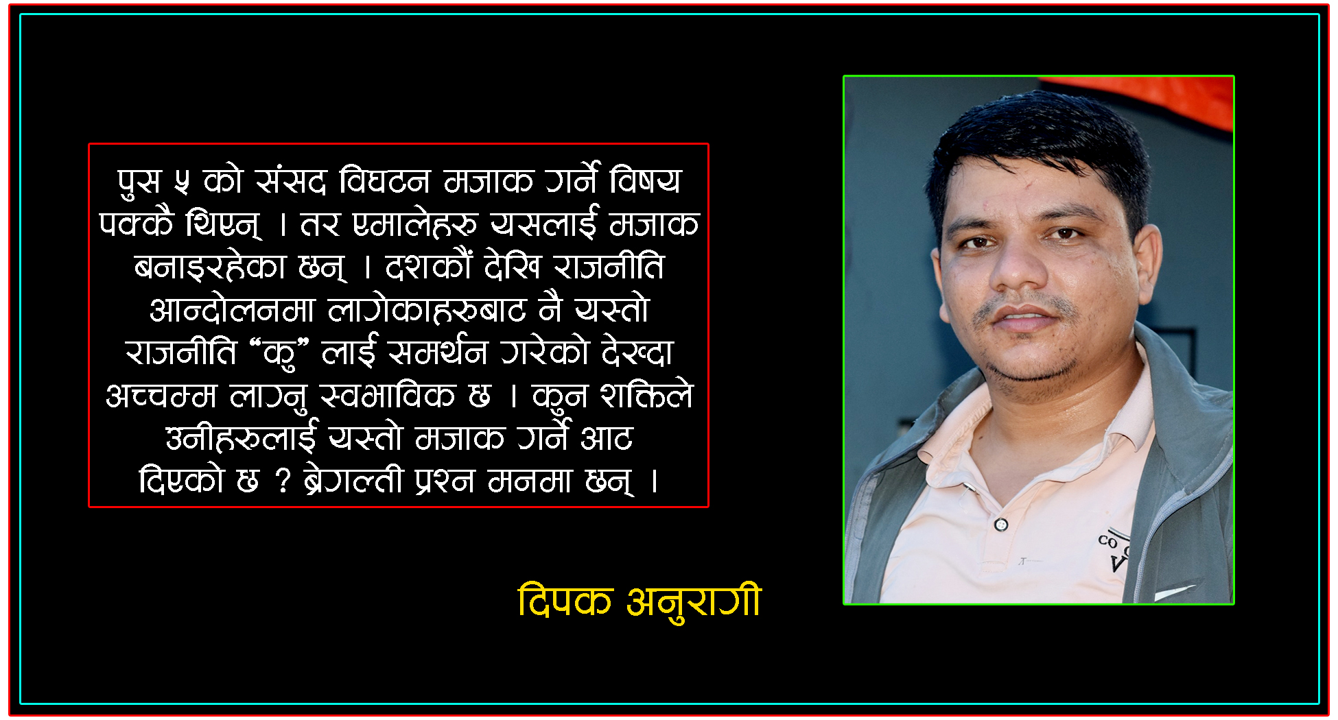 पुस ५ को संसद विघटन मजाक गर्ने विषय पक्कै थिएन् । तर एमालेहरु यसलाई मजाक बनाइरहेका छन् । दशकौं देखि राजनीति आन्दोलनमा लागेकाहरुबाट नै यस्तो राजनीति ‘कु’ लाई समर्थन गरेको देख्दा अच्चम्म लाग्नु स्वभाविक छ । कुन शक्तिले उनीहरुलाई यस्तो मजाक गर्ने आट दिएको छ ? ब्रेगल्ती प्रश्न मनमा छन् । संसदको विघटन स्वभाविक भएको ठान्नेहरु समृद्धि विरोधी मात्र होइनन् । उनीहरु क्रुर तानाशाह हिलटरका समेत समर्थक हुन् । पुस ५ को प्रतिगमन पश्चात यो एक बर्षमा देशले कति क्षति व्यहोरेको छ ? यसको हिसाब निकाल्न जरुरी छ । यो प्रतिगमनले भौतिक क्षति मात्र होइन् ‘क्रुर’ मानवीय क्षति पनि गराएको छ । कोरोना संक्रमणले भयावह स्थिति निम्ताउँदा तत्कालिन ओली सरकारले अक्सिजन उपलब्ध गराउन नसक्दा सयौं व्यक्तिले अकालमा ज्यान गुमाउनु परेको घटना नेपाली जनताले भुलेका छैनन् । सायदै संसदको हत्या नहुँदो हो त कोरोनासंग लड्न सक्ने शक्ति सरकारले आर्जन गर्न सक्दो हो । मुलुकमा अस्थिरता श्रृङ्खलाको नायक बन्न खोज्दा ओली सरकारबाट सयौं नागरिकले ज्यान गुमाए । यो त तत्कालिन असर हो भने राजनीति अपराधको जति नै भत्सर्ना गरेपनि कम हुन्छ ।