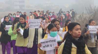 दाङ । बलात्कारपछि हत्या गरिएकी १७ वर्षीया भारगरथी भट्टको न्यायको लागि विद्यार्थीहरु सडकमा आएका छन्।