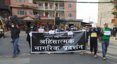 काठमाडौँ । नागरिक समाजका अगुवाहरुले संसद विघटनको विरुद्धमा आज शनिबार पनि काठमाडौँमा प्रदर्शन गरेका छन्।