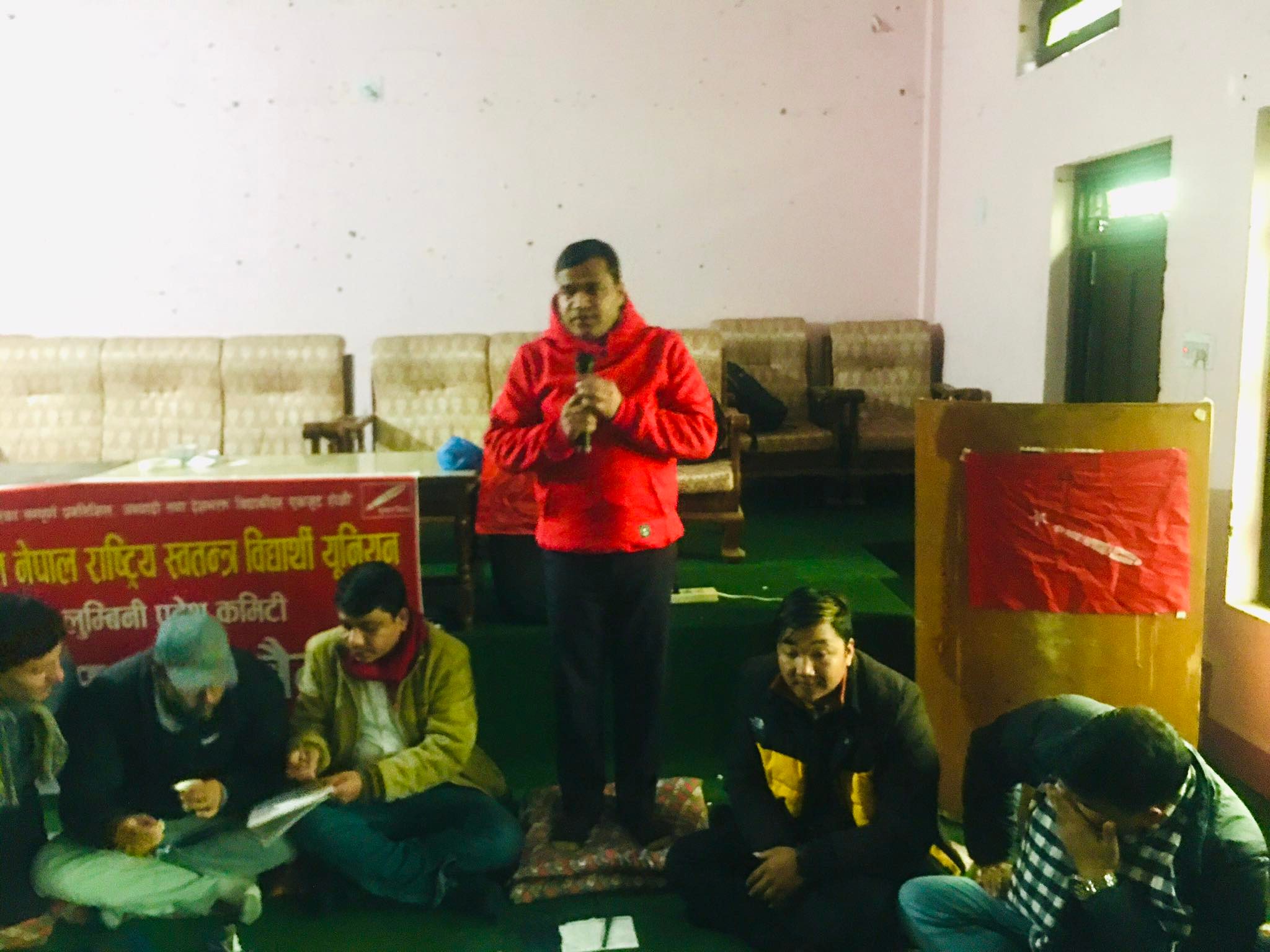 बैठकलाई सम्बोधन गर्दै अनेरास्ववियूका केन्द्रीय उपाध्यक्ष तथा प्रदेश इन्चार्ज माधव पन्तले अनेरास्ववियूको विगत जोडिएको संगठन आफुहरुको भएको दाबी गर्नुभयो । केपी ओलीको प्रतिगमन विरुद्ध अनेरास्ववियू सडकमा उत्रिएको स्मरण गर्दै गलत जसले गरेपनि गलतका विरुद्ध लाग्ने संगठन अनेरास्ववियू भएको बताउनुभयो । लुम्बिनीमा अनेरास्ववियूको इतिहास गर्विलो भएको भन्दै कमिटीले गरेका निर्णय अक्षरक्ष कार्यान्वयन हुनुपर्नेमा जोड दिनुभयो ।