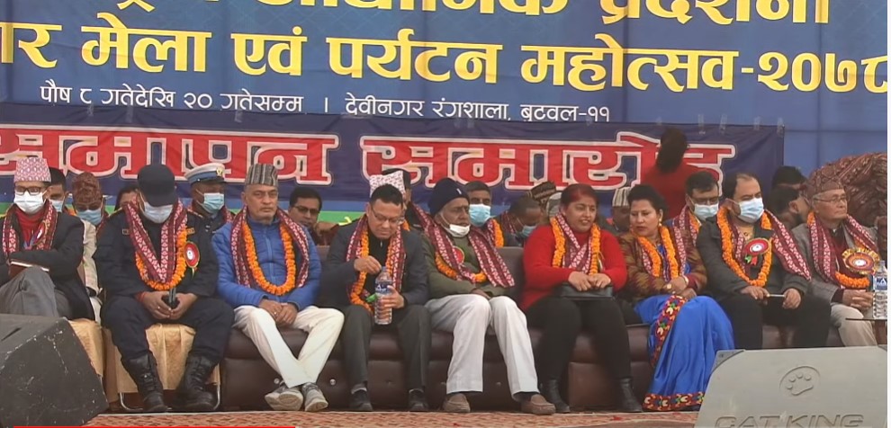 ‘स्वाधीन अर्थतन्त्रका लागि राष्ट्रिय औद्योगिकरण तथा ब्यापार विविधिकरण’ नाराका साथ बुटवलमा सञ्चालित चौथो औद्योगिक प्रदर्शनी तथा ब्यापार मेला ३० करोड कारोबार गर्दै मंगलबार समापन भएको छ । कोरोना महामारीका कारण दुई वर्षसम्म बुटवलमा मेला महोत्सव हुन नसकेको अवस्थामा पुस ८ गतेदेखि २० गतेसम्म सञ्चालन भएको मेला अवधिभर लक्ष्य भन्दा धेरै ८ लाख दर्शकले अवलोकन गरेका आयोजकले जनाएका छन् ।
