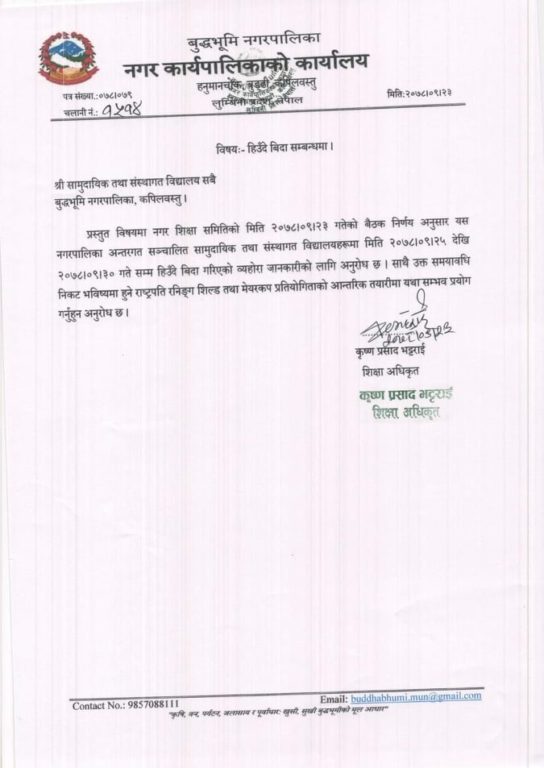 कपिलवस्तुको बुद्धभूमि नगरपालिकाका विद्यालयमा पुस २५ गतेदेखि विदा हुने भएको छ । नगरपालिकाभित्र रहेका सामुदायिक तथा संस्थागत विद्यालयमा पुस २५ गतेदेखि पुस ३० गतेसम्म हिउँदे विदा हुने नगरपालिकाका शिक्षा अधिकृत कृष्ण प्रसाद भट्टाराईले जानकारी दिनुभएको छ ।