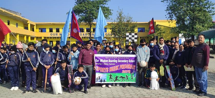 ‘राष्ट्रका लागि खेलकुद, स्वास्थ्यका लागि खेलकुद’ भन्ने मुल नाराका साथ कपिलवस्तुको बाणगंगा १ मा रहेको आवर विज्डम आवासीय माध्यमिक विद्यालयमा खेलकुद सप्ताह सुरु भएको छ । खेलकुद सप्ताहको उद्धघाटन बिध्यालयका प्राचार्य नारायण शर्माले गर्नु भएको थियो । उद्धघाटन सत्रमा बोल्दै बिद्यालयका शिक्षक तारा प्रसाद पाण्डेले खेलले बिद्यार्थीहरुको शिक्षण सिकाईमा समेत प्रत्यक्ष सहयोग गर्ने भएकोले खेल अनिवार्य रहेको बताउनु भएको थियो ।