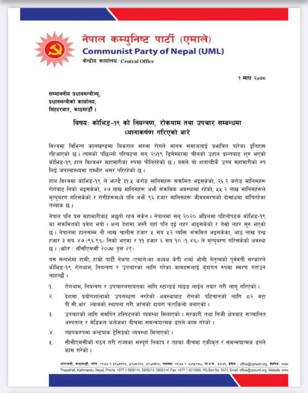 कोरोना भाइरसको नियन्त्रण तथा रोकथाममा सरकार गम्भीर नभएको भन्दै प्रमुख प्रतिपक्षी दल नेकपा एमालेले प्रधानमन्त्री शेरबहादुर देउवाको ध्यानाकर्षण गराएको छ ।