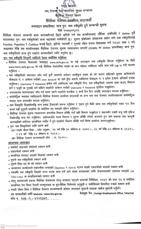वि।सं। २०७७ पुसबाट भौतिक उपस्थिति र अनलाइन दुवै माध्यमबाट पुनः श्रम स्वीकृतिको काम भइरहेकोमा अबदेखि अनलाइनबाट मात्र पुनः श्रम स्वीकृतिको काम हुन लागेको हो । श्रम स्वीकृतिलाई ुफेसलेसु, ुपेपरलेसु र ुक्यासलेसु बनाइ छिटो, छरितो र पारदर्शी रुपमा गुनासो रहित सेवाप्रवाह गर्न अनलाइन प्रणालीबाट मात्र पुनः श्रम स्वीकृतिको काम गर्न लागिएको वैदेशिक रोजगार कार्यालयले जारी गरेको सूचनामा उल्लेख छ । योसँगै अब पुनस् श्रम स्वीकृतिको काम वैदेशिक रोजगार सूचना व्यवस्थापन प्रणाली एफईआईएमएस मार्फत अनलाइनबाट मात्रै हुने वैदेशिक रोजगार कार्यालयले जनाएको छ ।