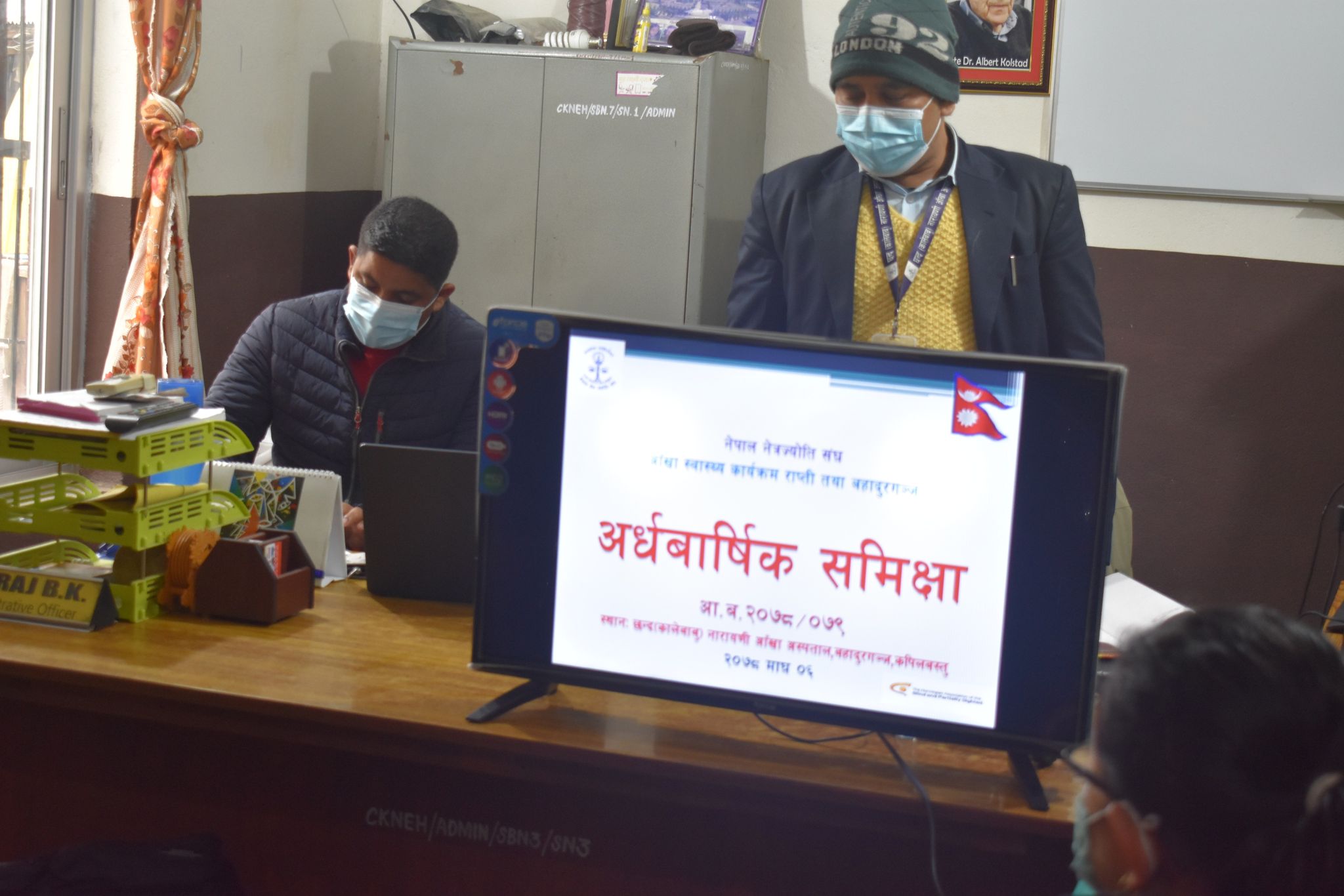 समिक्षा कार्यक्रममा नेपाल नेत्रज्योति संघ, आँखा स्वास्थ्य कार्यक्रम राप्ती तथा बहादुरगंजका प्रमुख प्रशासक शम्सेर थापाले आँखा स्वास्थ्य कार्यक्रम राप्ती तथा बहादुरगंज अन्तर्गत संचालित ३ वटा आँखा अस्पताल र उपचार केन्द्रहरुले सन् २०२१ मा हासिल गरेको उपलब्धिको बारेमा जानकारी दिएका थिए । त्यसैगरी अस्पतालका लेखापाल जेनिशा थापाले अस्पतालको आम्दानी तथा खर्चको बारेमा प्रष्ट पारेकी थिईन् ।