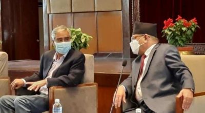 काठमाण्डौ । प्रधानमन्त्री शेरबहादुर देउवा र नेकपा माओवादी केन्द्रका अध्यक्ष पुष्पकमल दाहाल प्रचण्डबीच आज भेटवार्ता