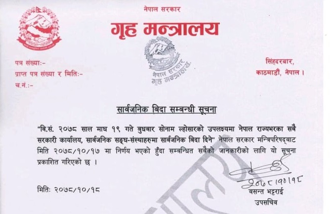 भोलि देशभर सार्वजनिक बिदा दिने सरकारले निर्णय गरेको छ ।