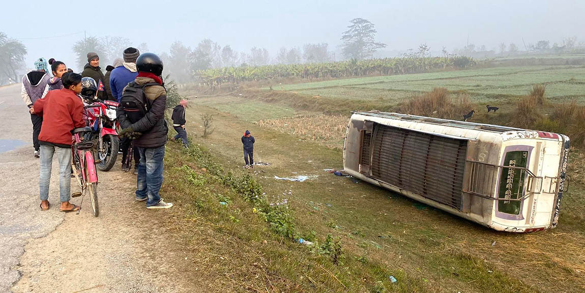 बर्दियामा यात्रुवाहक बस दुर्घटना हुँदा ३५ जना घाइते भएका छन् । बिहिबार बाँसगढी नगरपालिका वडा नम्बर ३ स्थित पूर्वपश्चिम राजमार्गमा बस सडक किनारमा पल्टिएको हो ।