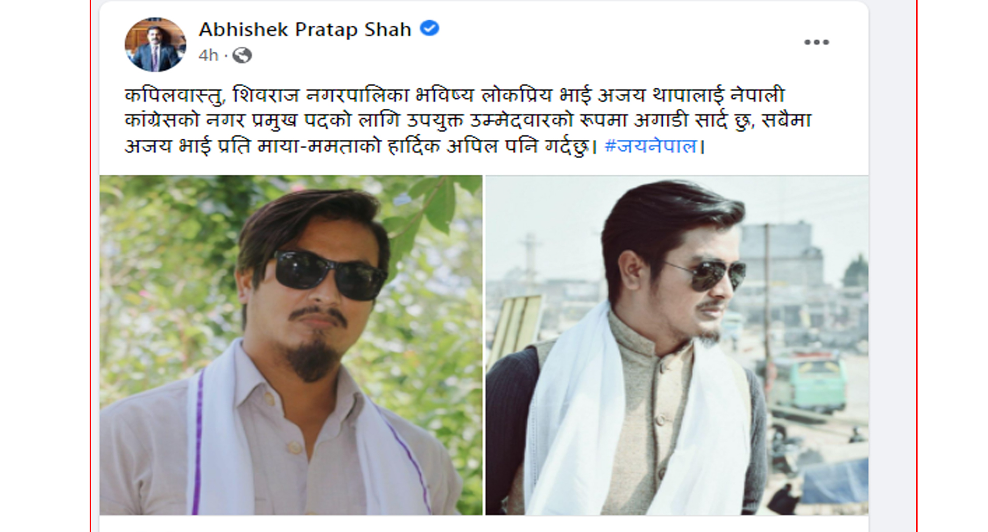 शाह फेसबुकमा लेख्छन्, ‘कपिलवस्तु शिवराज नगरपालिकाको भविष्य, लोकप्रिय भाई अजय थापालाई नेपाली कांग्रेसको नगर प्रमुख पदको लागि उपयुक्त उम्मेदवारको रूपमा अगाडी सार्द छु, सबैमा अजय भाई प्रति माया, ममताको हार्दिक अपिल पनि गर्दछु । जय नेपाल ।’