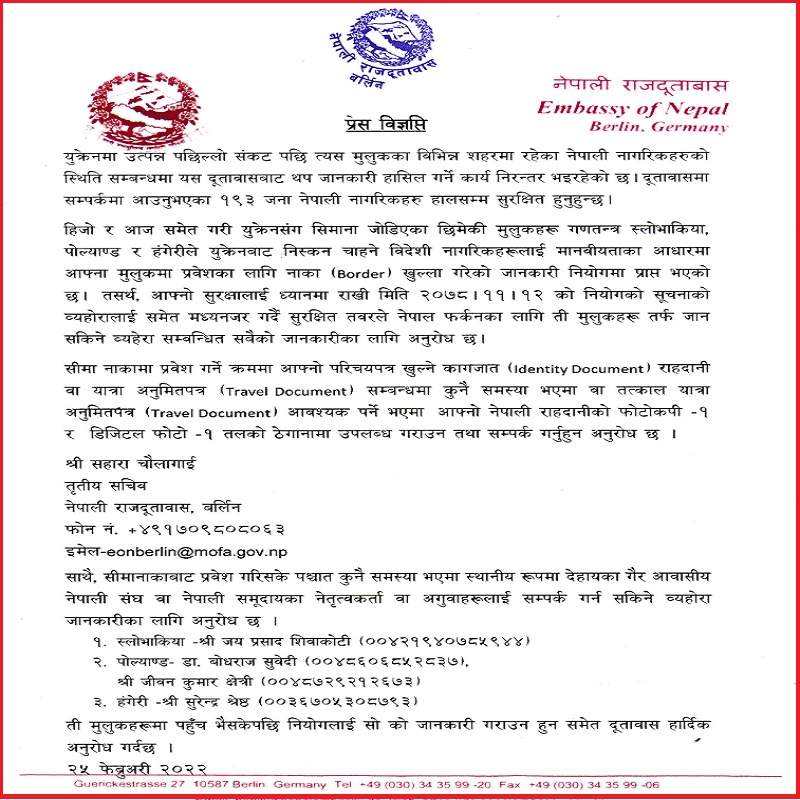 दूतावासले युक्रेन सरकार र सम्बन्धित कलेजरविश्वविद्यालय तथा कम्पनीले जारी गरेको निर्देशनको पूर्ण पालना गर्न, सम्भव भएमा सडक तथा रेलमार्गबाट युक्रेनकै पश्चिमतर्फका सुरक्षित ठाउँमा जान, राहदानी, परिचयपत्र, बैंकको कार्डलगायत कागजात आफ्नो साथमा राख्न र साथीभाइ तथा परिवार र नियोगसँग निरन्तर सम्पर्कमा रहन पनि आग्रह गरेको छ । युक्रेनको पछिल्लो घटनाक्रमबारे नियमित जानकारी राख्न र आवश्यक परेमा नेपाली दूतावासमा सम्पर्क गर्न पनि भनिएको छ ।