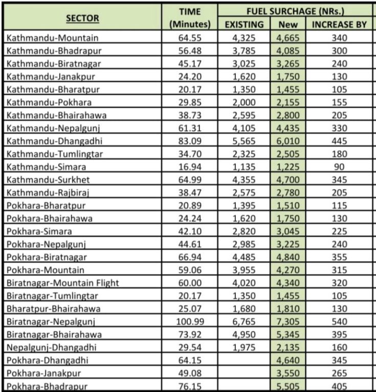 भोलिदेखि लागु हुनेगरी इन्धन शुल्क बढेको र भाडामा पनि वृद्धि भएको यति एअरलाइन्सका प्रवक्ता सुदर्शन बर्तौलाले जानकारी दिनुभयो । सबैभन्दा धेरै विराटनगर–नेपालगञ्ज रुटको भाडा पाँच सय ४० रुपैयाँले बढेको छ । यस्तै, काठमाण्डौ–धनगढीको भाडा चार सय ४५ रुपैयाँ बढेको छ । यस्तै काठमाण्डौ–भद्रपुरको तीन सय, काठमाण्डौ–सुर्खेतको तीन सय ४५ र काठमाण्डौ–नेपालगञ्जको तीन सय ३० रुपैयाँ भाडा बढेको छ ।