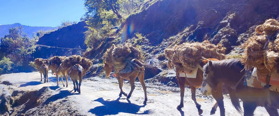 दार्चुलाको नौगाड गाउँपालिका–१ का स्थानीयवासी खच्चडमार्फत अल्लो ढुवानी गर्दै। यस गाउँपालिकामा सबैभन्दा बढी अल्लो उत्पादन हुने गर्छ। सडक नपुगेका कारण उनीहरूले खच्चडमार्फत अल्लो ढुवानी गरेका हुन्। तस्बिर- नरेन्द्रसिह कार्की/रासस