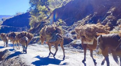 दार्चुलाको नौगाड गाउँपालिका–१ का स्थानीयवासी खच्चडमार्फत अल्लो ढुवानी गर्दै। यस गाउँपालिकामा सबैभन्दा बढी अल्लो उत्पादन