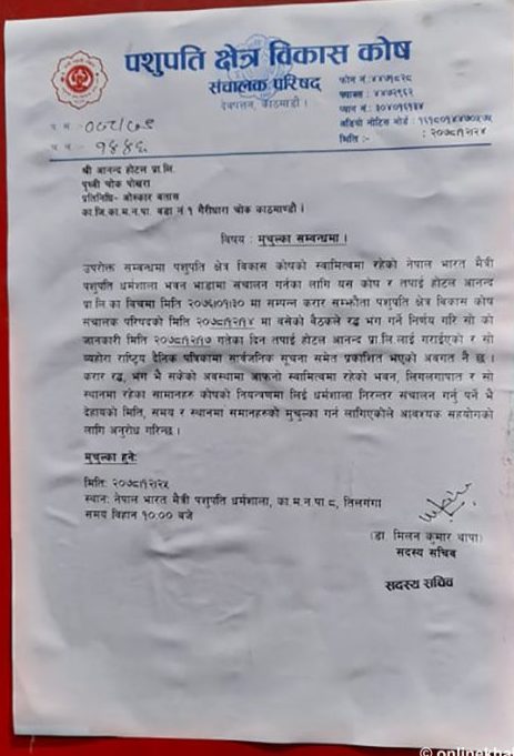 त्यसपछि गत सोमबार पशुपति क्षेत्र विकास कोषले होटल आनन्द सञ्चालन गरिएको पशुपति धर्मशाला भवन खाली गर्न सार्वजनिक सूचना निकालेको थियो । सूचनामा धर्मशालामा रहेका सरसामान हटाउन भनिएको थियो ।
