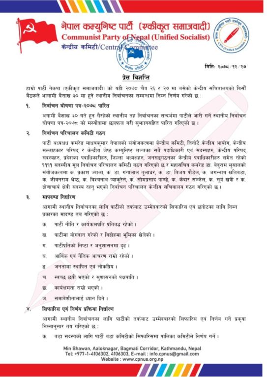 नेकपा एकीकृत समाजवादीले स्थानीय तह निर्वाचनका लागि सबै पालिकामा उम्मेदवारहरु सिफारिस गर्न भनेको छ । उम्मेदवारी भने गठबन्धन गर्दा पार्टीले पाएको स्थानमा मात्र दिने केन्द्रीय सचिवालयको निर्णय छ ।
