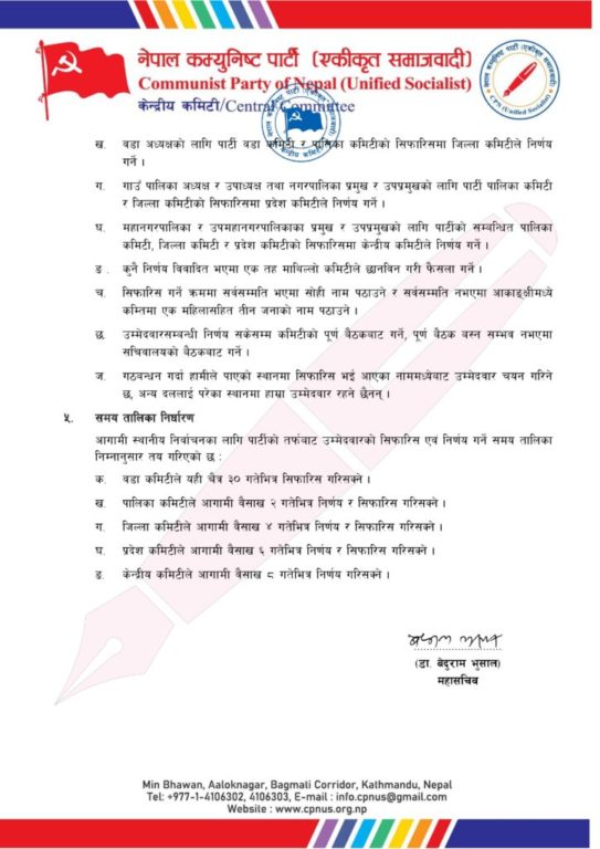 उपमहानगर र महानगरपालिकाका प्रमुख र उपप्रमुखको उम्मेदवार पालिका, जिल्ला र प्रदेश कमिटीको सिफारिसमा केन्द्रीय कमिटीले टुंगो लगाउने छ ।